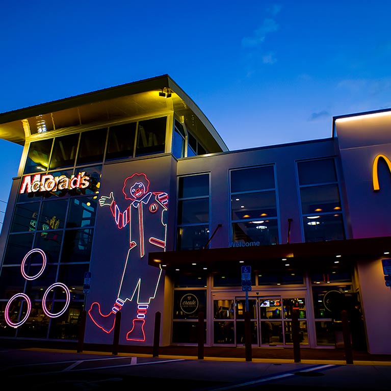 The playful and colorful neon lights in the World’s Largest Entertainment McDonald’s create a vibrant and fun effect, attracting passersby and guests alike.